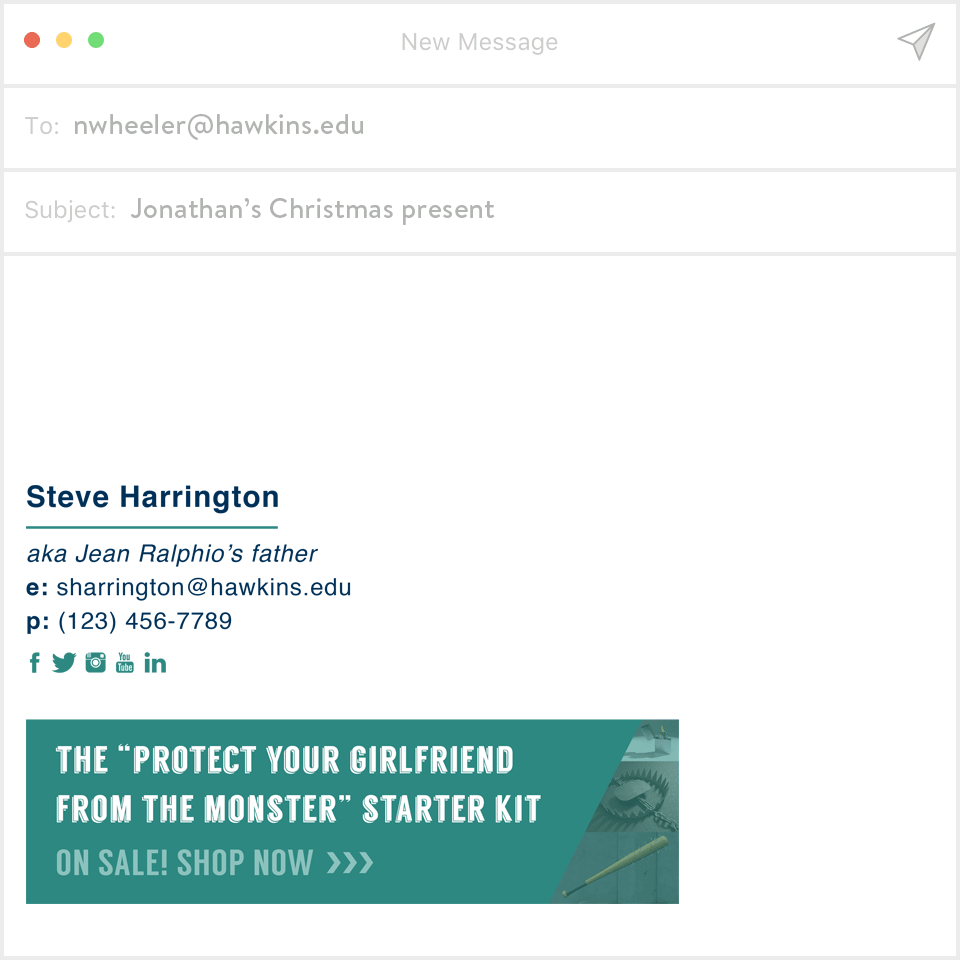 In honor of the arrival of Stranger Things season 2, the Sigstr team came up with email signatures for each character! Eleven, Mike, Will, Steve, + more...